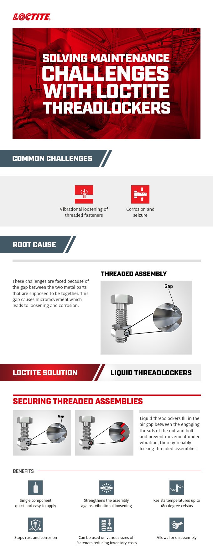 When fasteners loosen, this can cause serious accidents and a total shutdown of a production plant. Loctite threadlockers add an extra level of protection by defending against improper tightening, shocks and vibration, thermal expansion and corrosion.