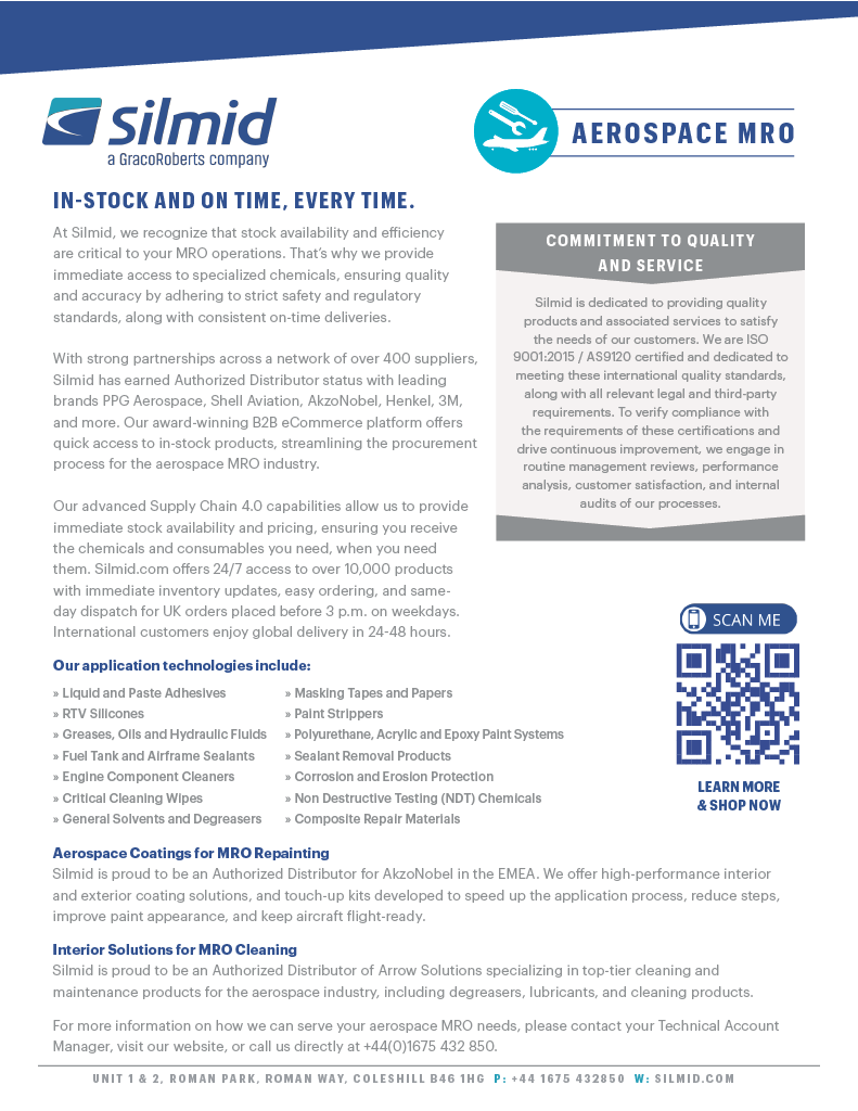 With strong partnerships across a network of over 400 suppliers, Silmid has earned Authorized Distributor status with leading brands PPG Aerospace, Shell Aviation, AkzoNobel, Henkel, 3M, and more.