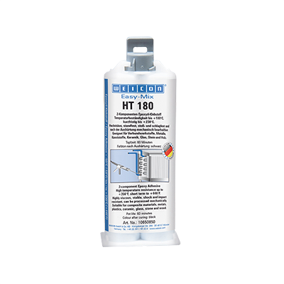 Weicon Easy-Mix HT 180 is a two component adhesive based on epoxy resin with high temperature resistance. The adhesive is particularly suitable for the bonding of composite materials and metal and can be spot-welded while curing.