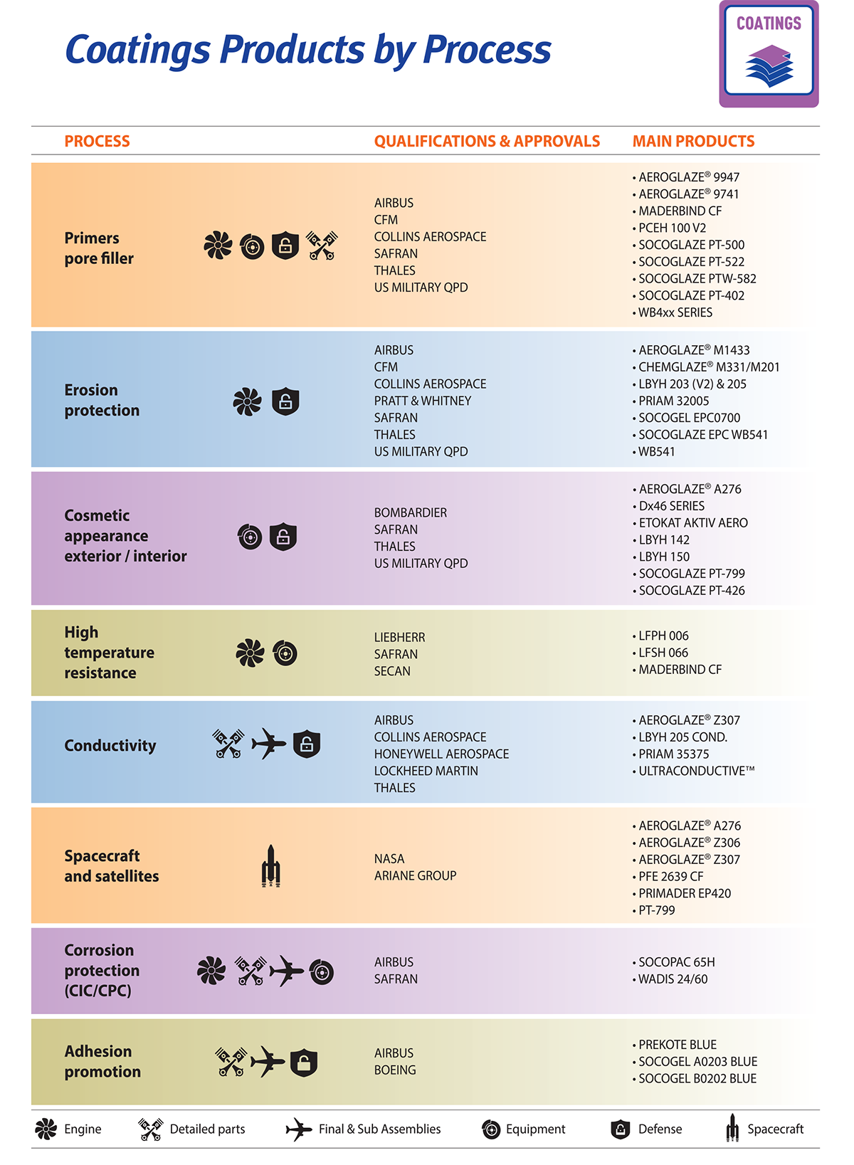 Socomore offers a comprehensive range of coatings designed to meet the diverse needs of the aerospace and defense industry, suitable for various substrates such as composite, thermoplastic, metallic (including aluminum, titanium, steel, and stainless steel), and glass.