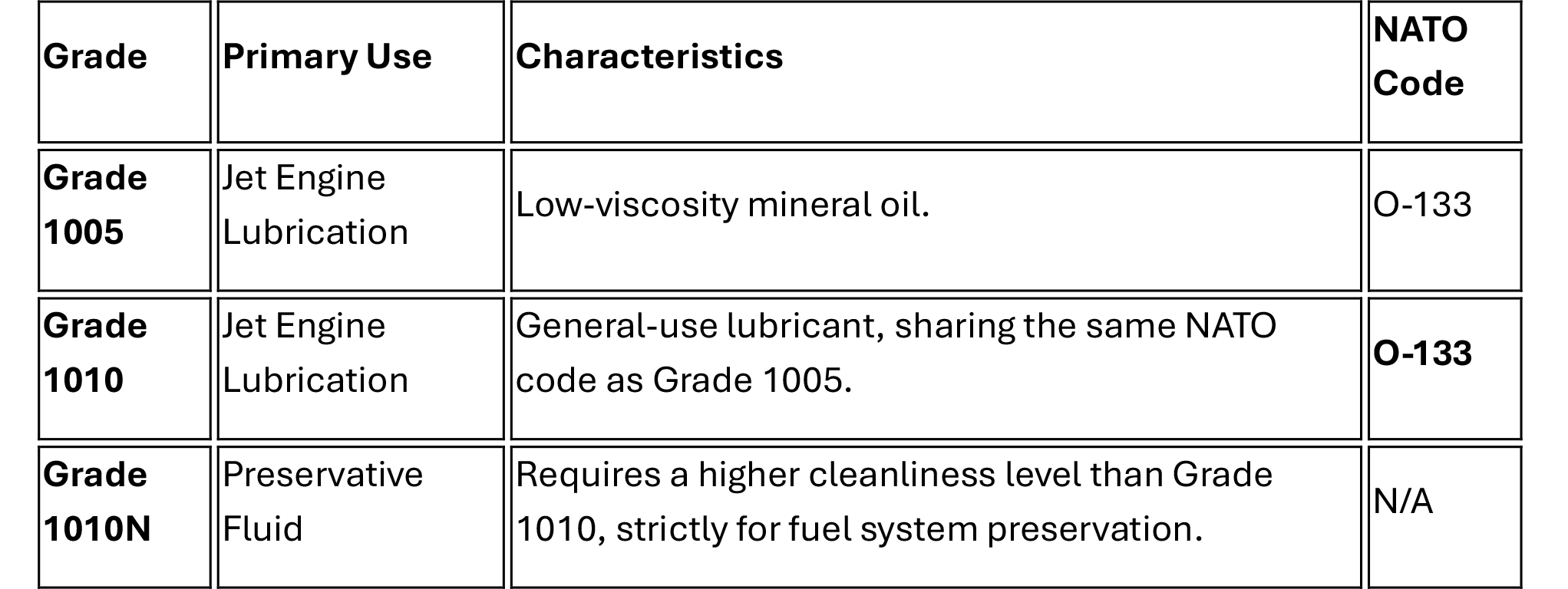 Grade 1010 is the most commonly referenced for engine use and is identified by the NATO Code O-133.