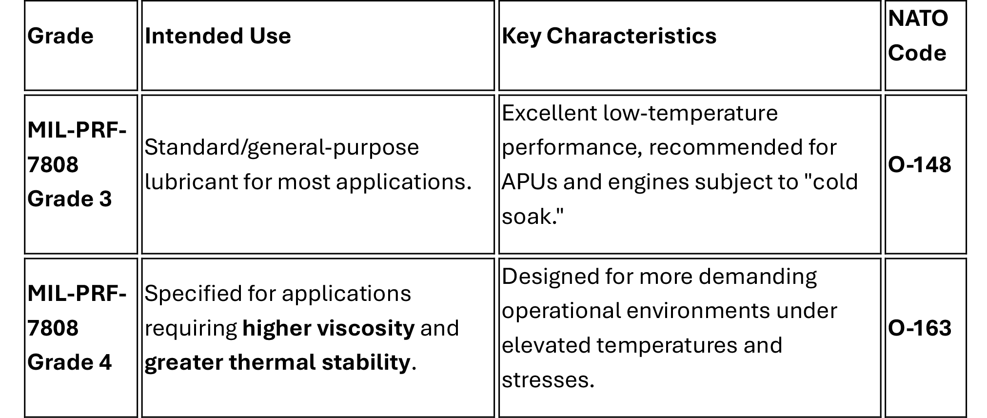The MIL-PRF-7808 specification covers two distinct grades of synthetic base lubricating oil, classified based on viscosity and thermal stability requirements: