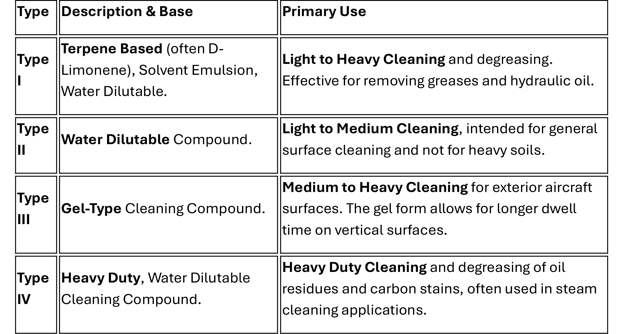 The MIL-PRF-87937 specification covers four distinct types of cleaning compound, classified by their chemical composition and intended duty level: