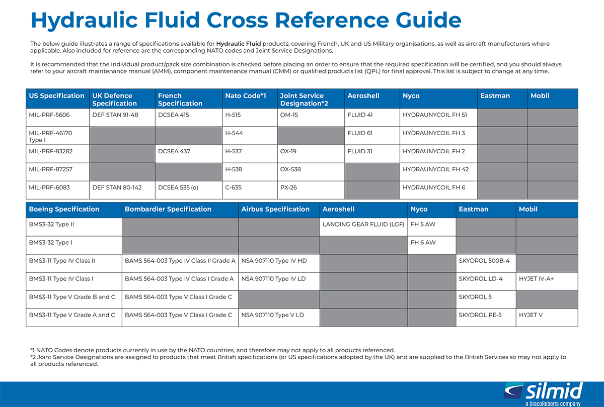 The guide below outlines a range of official specifications assigned to aerospace and defence hydraulic fluid products. It includes corresponding NATO codes, Joint Service Designations, French and UK equivalents, and airframe approvals where applicable.
