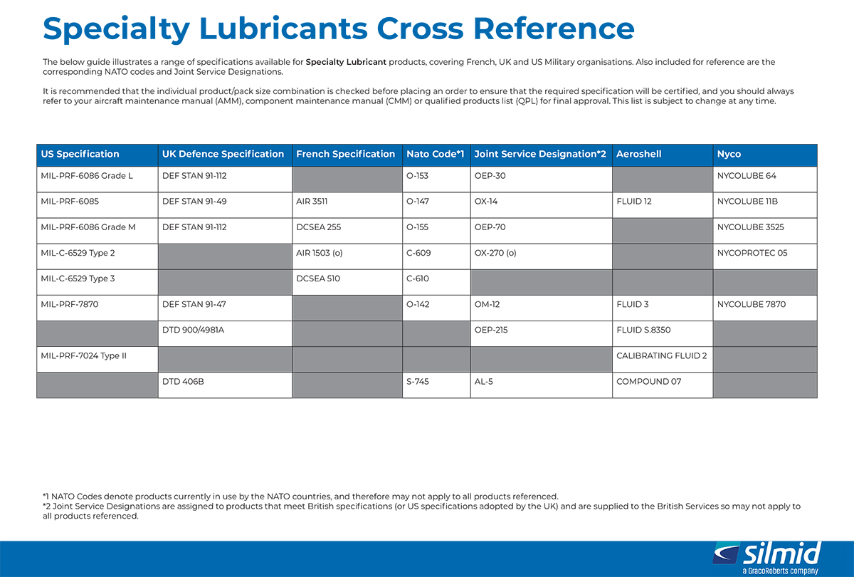 Silmid’s specialty lubricant cross-reference chart helps engineers, technicians, and procurement teams identify equivalent specifications across French, UK, and US military organisations. Use it to align military specifications with corresponding NATO codes and Joint Service Designations, supporting accurate sourcing and compliance for aerospace, defence, and industrial maintenance tasks. Always verify the individual product and pack-size certification before ordering, and refer to your aircraft maintenance manual (AMM), component maintenance manual (CMM), or qualified products list (QPL) for final approval, as specifications may change.