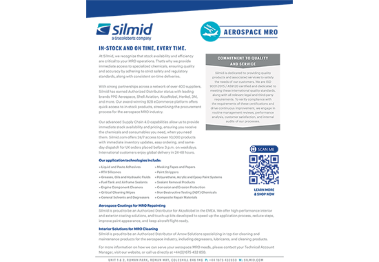 With strong partnerships across a network of over 400 suppliers, Silmid has earned Authorized Distributor status with leading brands PPG Aerospace, Shell Aviation, AkzoNobel, Henkel, 3M, and more.